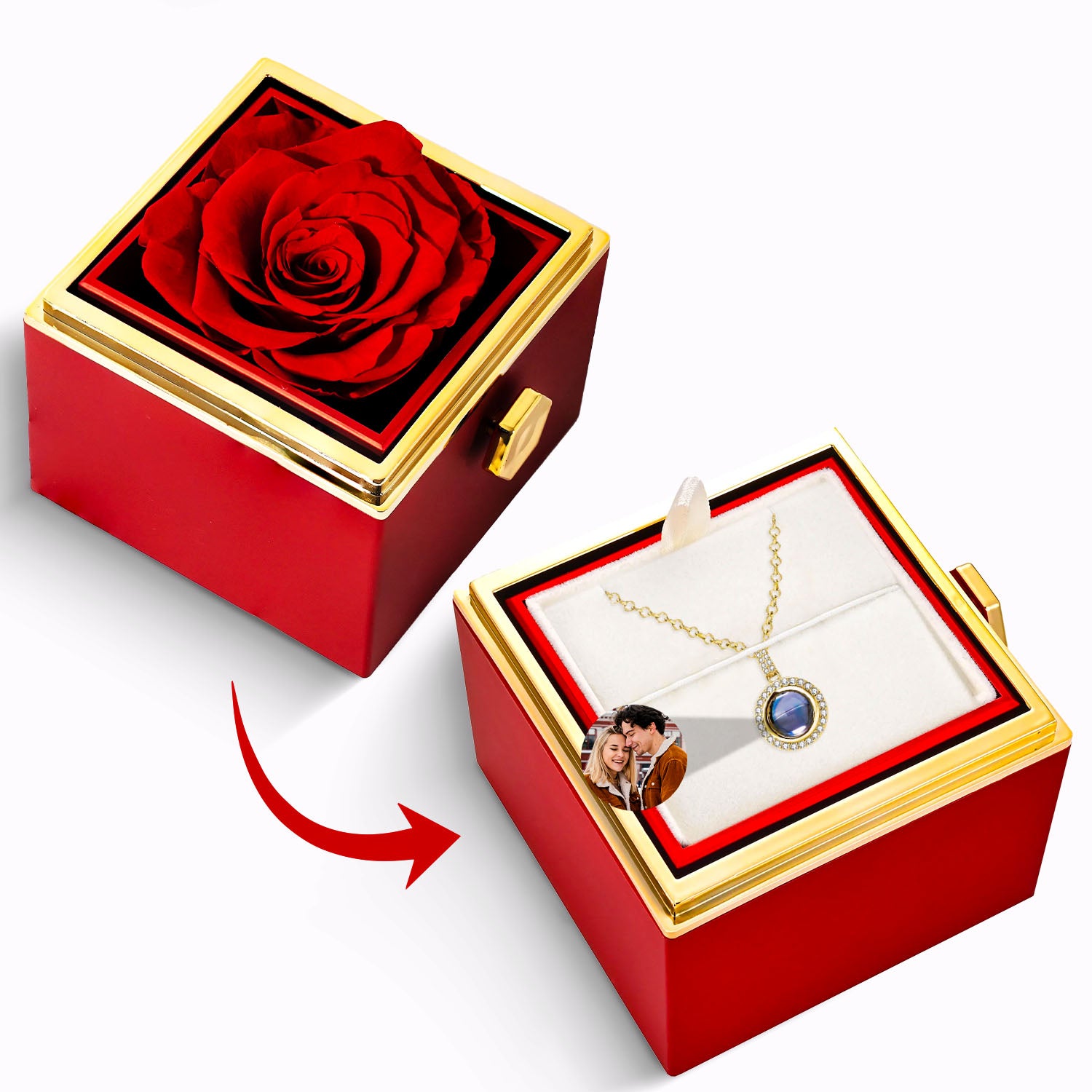 Ce coffret unique renferme une rose éternelle et un bijou personnalisé, vous permettant d’emporter partout avec vous la photo de votre être aimé ou d’un souvenir inoubliable.